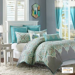 Update your bedroom with the globally inspired style of the Madison Park Nisha Comforter Set. This comforter features an updated paisley pattern inside an ogee design, creating an elegant look. Matching shams and coordinating Euro shams complement the comforter. Two decorative pillows with beading and embroidery add the finishing touches. This bedding set is also OEKO-TEX certified, meaning it does not contain any harmful substances or chemicals to ensure quality comfort and wellness.