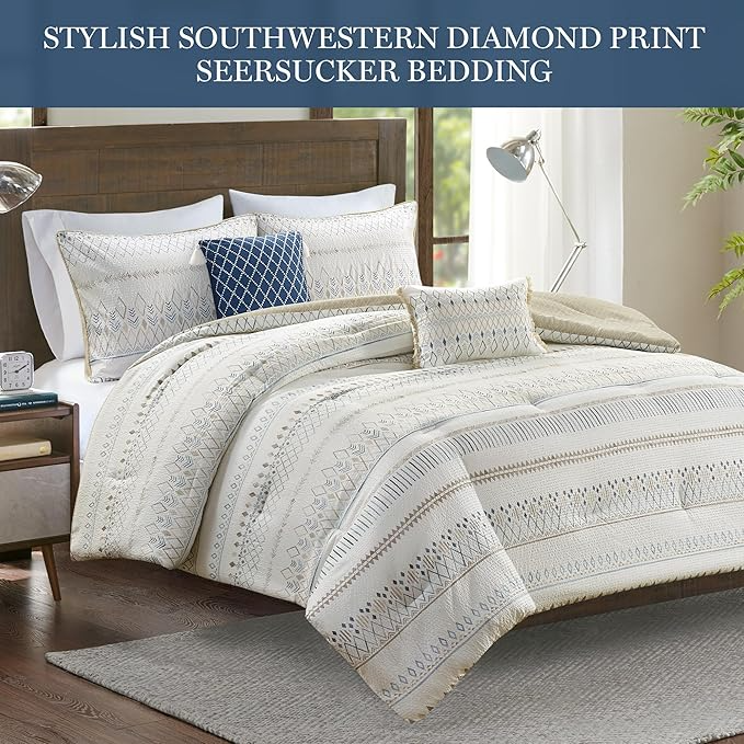Soft and lightweight, the Madison Park Fraser comforter set brings a Southwest inspired touch to your bed. A diamond print in soft blue and taupe colors adorns the light beige face, while a taupe diamond print on the reverse adds a complementary farmhouse look. This set includes a comforter, 2 shams, and 2 decorative pillows with tassels or fringe to tie back into the bedding. This reversible comforter also features an antimicrobial treatment to help reduce the growth of odor causing bacteria and keep the fabric lasting longer. This set is machine washable in a large capacity commercial washer/dryer for best care.Read More