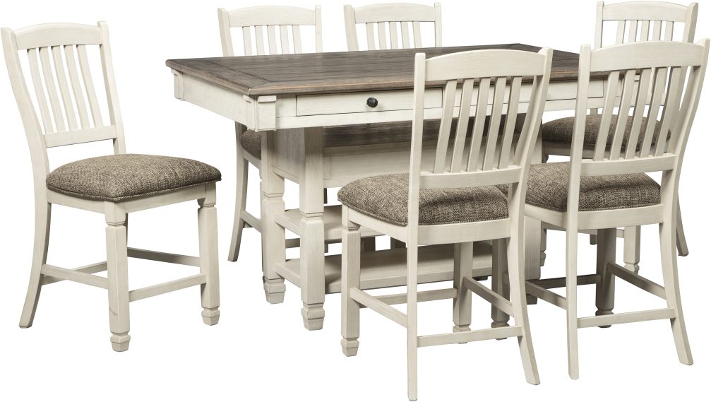 Bring Parisian cottage style into your home with the Bolanburg 7-piece rectangular dining set. The rustic butcher-block tabletop in warm oak and acacia veneers—plus 6 high-back, counter-height padded chairs with subtle bistro tones—creates the feeling of rural France you desire. Tuck away table essentials in the 4 drawers to tidy up, and keep up to 7 bottles of wine in the built-in cubbies. Savor the casual elegance of the cottage style you love, and express your romantic side with this antique white and weathered wood dining set.