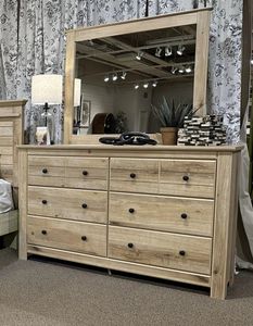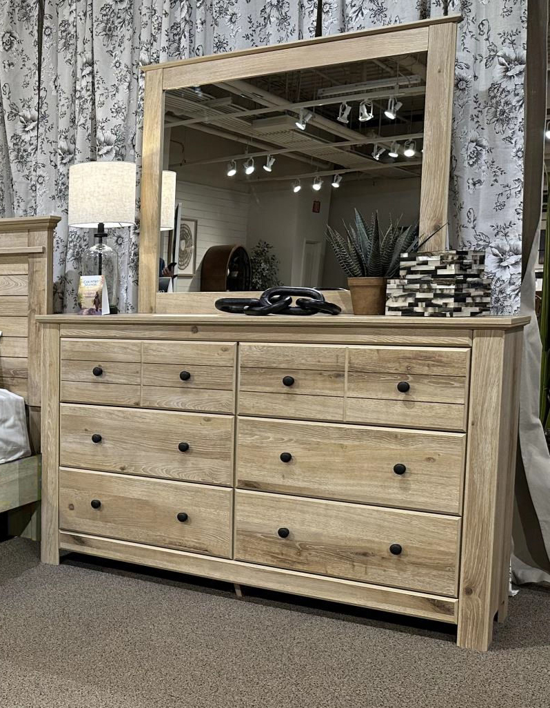 Looking to create a bedroom that feels airy and beautifully put together? This casually comfy dresser and mirror is your perfect solution. Its clean lines, replicated oak grain and on-trend natural finish exude a charming cottage-inspired feel that brightens your restful retreat. Spacious drawers with dark bronze-tone knobs stow away clothes and more.Read More