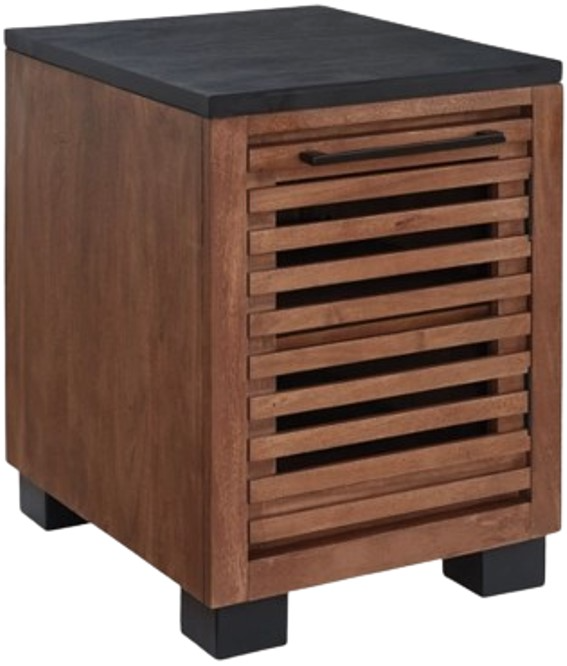 Double down on casual chic with the two-tone look of this chairside end table. Its warm brown and matte black finishes reflect your eye for modern design. The trend-right slatted styling brings added charm. And with a handy cabinet and shelf, keeping sofa-side essentials close is a breeze.Read More