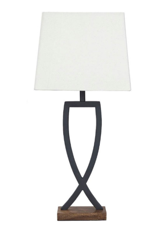 The Makara table lamp features and open design, crisscrossed lines, and rectangular hardback shades for a streamlined look.