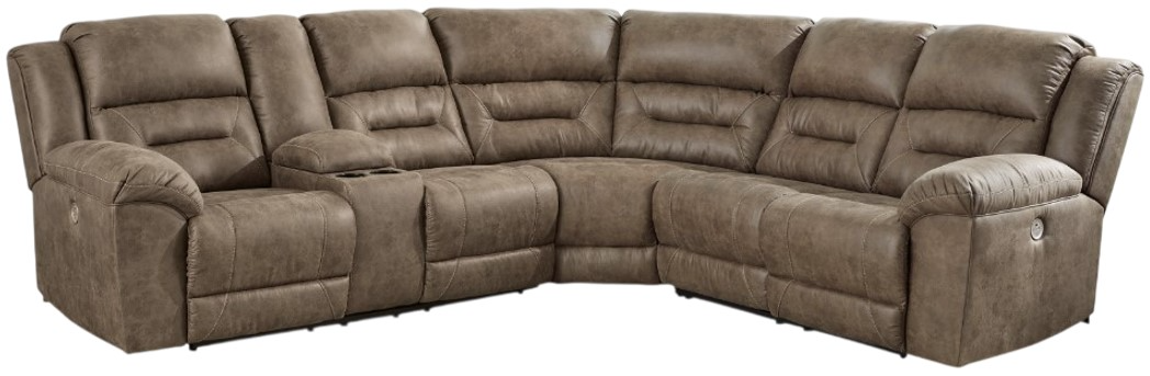 This power reclining sectional is designed exclusively for those who are serious about R and R. Its overstuffed cushions and pillow top arms feel oh-so-plush, and the faux leather upholstery accented with jumbo stitching is silky soft. Go from upright to reclined relaxation with just one touch.Read More