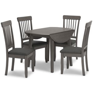 Casual contemporary design. Made with select veneers, MDF substrate and hardwood solids. Medium gray wood finish contrasted nicely with a charcoal gray polyester fabric chair seat. Round dining table with 2 small drop leaves to make the most of your dining area.Read More