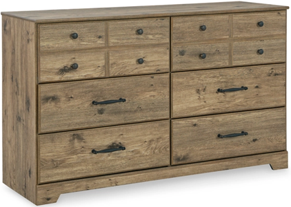 Warm rustic finish over replicated oak grain with authentic touch. Hardware is finished in a dark bronze metal finish. Side roller glides for smooth operating drawers. Drawer interiors are lined with a faux linen laminate for a clean, finished look. Mirror has the versatility to mount on the dresser or to the wall horizontally or vertically.Read More