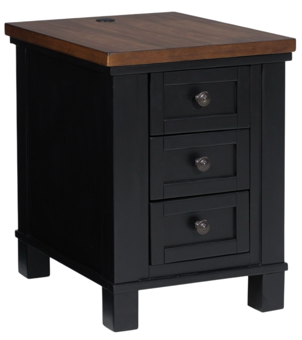Raise the bar on modern farmhouse style with this chairside end table. Its sturdy silhouette and casual good looks are accentuated with a two-tone finish, which pairs a warm satin black base with a contrasting butcher block veneer top. Spacious storage drawers and dual USB charging ports keep devices powered up and close at hand.Read More