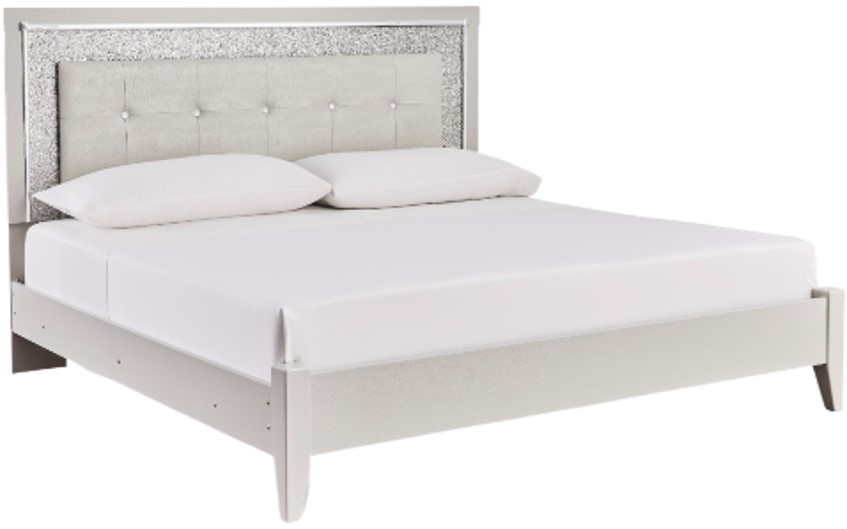 Bright, bold luxury. This king upholstered bed dazzles with its attention to detail. Your love of glamorous style is reflected in the tufted upholstery with faux alligator effect, exquisitely paired with faceted chrome-tone and glittery details. Complete with LED lighting around the headboard.Read More