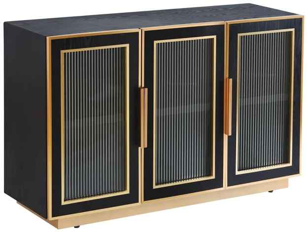 This stylish sideboard blends modern industrial charm with refined storage, featuring a sturdy wooden and metal construction accented by corrugated clear glass doors. The rich ebony finish is complemented by elegant gold hardware, creating a bold yet sophisticated statement for dining rooms or living spaces.Read More