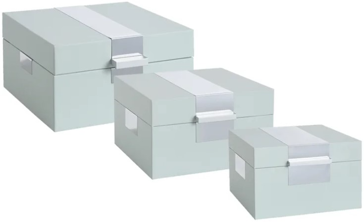 The Norman Wyatt Home 3-Piece Brushed Silver/Spa Blue Leather Accessory Boxes blend elegance and functionality. Featuring a brushed silver exterior and spa blue leather accents, these boxes provide a stylish storage solution for accessories. Perfect for adding a contemporary, sophisticated touch to any space.Read More