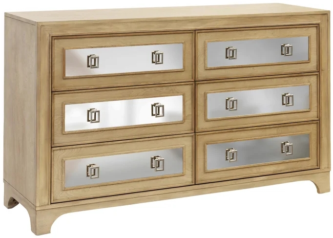 This elegant dresser blends modern glamour with practical storage, featuring a taupe brown finish accented by mirrored drawer fronts. Crafted from birch veneer over MDF with poplar wood solids, it adds light, depth, and sophistication to bedrooms or living spaces.Read More