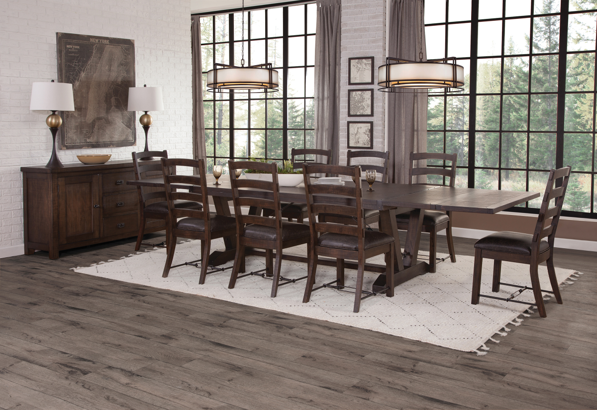 The Homestead Grand dining set was designed for a large dining room and adequate seating based on the occasion. This table expands with two 16" leaves allowing to seat ten people comfortably. Dining items feature industrial rustic hardware accents, like turnbuckle stretchers.Read More