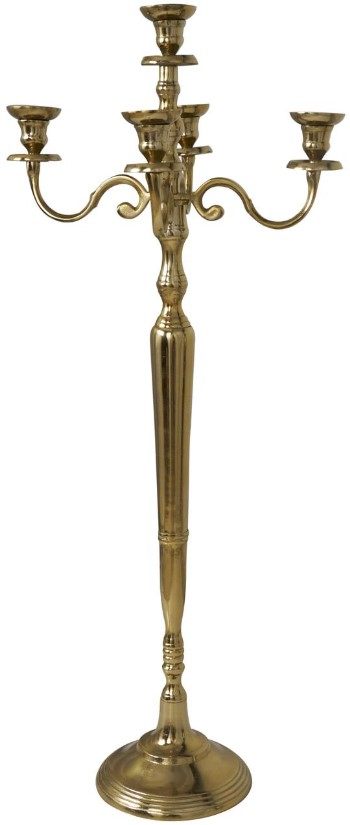 This traditional decorative candleholder is welded from aluminum to form five holders with scrollwork designs and tall pole, applied with a polished gold finish