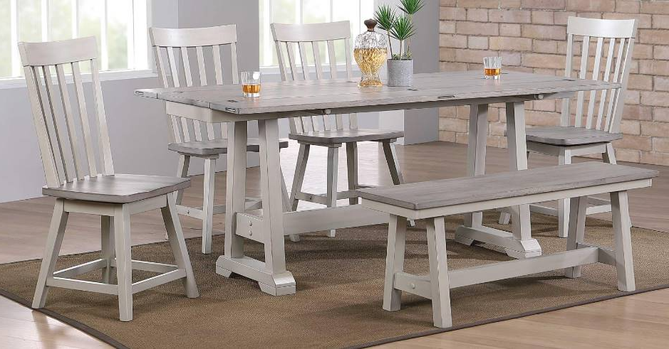 Enjoy and dine in style with the Montreal 6-piece dining set. This set includes wooden dining table features a almond and smoke gray finish, bench and has four chairs. Simple with a refined design, this dining set will definitely elevates the look of your dining space.Read More