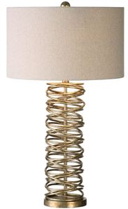 Layered metal rings finished in a heavily antiqued silver champagne. The round hardback drum shade is an oatmeal linen fabric with light natural slubbing.Read More