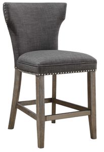 Supportive comfort in a curved back design, covered with warm charcoal gray linen and accented by polished nickel nail head trim. Honey stained frame is finished with heavy gray wash, with an antique brass finished kick plate. Seat height is 25".