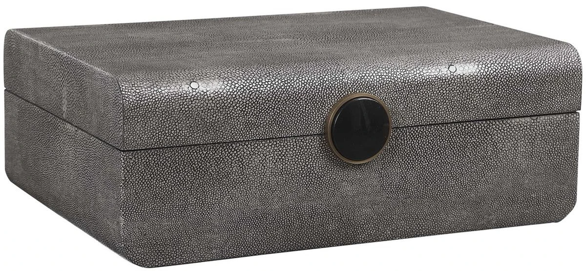 Inspired By The Art Deco Era, This Decorative Box Showcases A Faux Smoke Gray Shagreen Wrapped Exterior Accented By A Brushed Antique Brass And Black Enamel Closure. The Interior Is Finished In Matte Black.