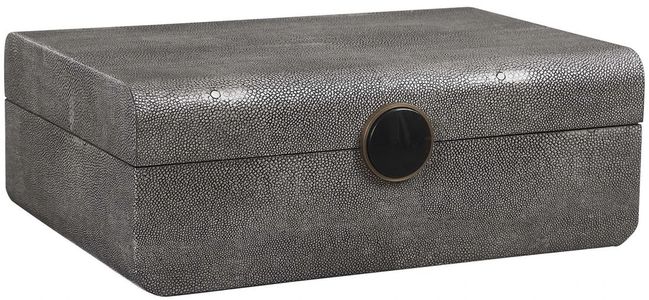 Inspired By The Art Deco Era, This Decorative Box Showcases A Faux Smoke Gray Shagreen Wrapped Exterior Accented By A Brushed Antique Brass And Black Enamel Closure. The Interior Is Finished In Matte Black.Read More