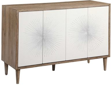 Showcasing hints of Scandinavian design, this four door accent cabinet provides a functional storage piece with versatile style. Featuring matte white textured doors with a striking starburst design with ombre gray centers. The case is layered in naturally finished oak veneer with wire brushed details, set on tapered legs. Each side opens to reveal 2 adjustable shelves.