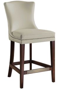 Sleek styling with a gently curved back, featuring soft faux leather in a cream white, with hand hammered polished nickel nail head trim. Birch wood frame is finished in a rich dark walnut stain with an antique bronze kick plate. Seat height is 26".