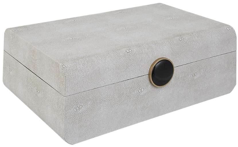 Inspired by the Art Deco era, this decorative box showcases a faux white shagreen wrapped exterior accented by a brushed antique brass and black enamel closure. The interior is finished in matte black.Read More