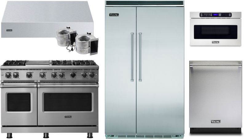 Viking® 6 Piece Stainless Steel Kitchen Package with a side by side refrigerator, pro style natural gas range, built in dishwasher, microwave drawer, wall mounted range hood, and internal blowerRead More