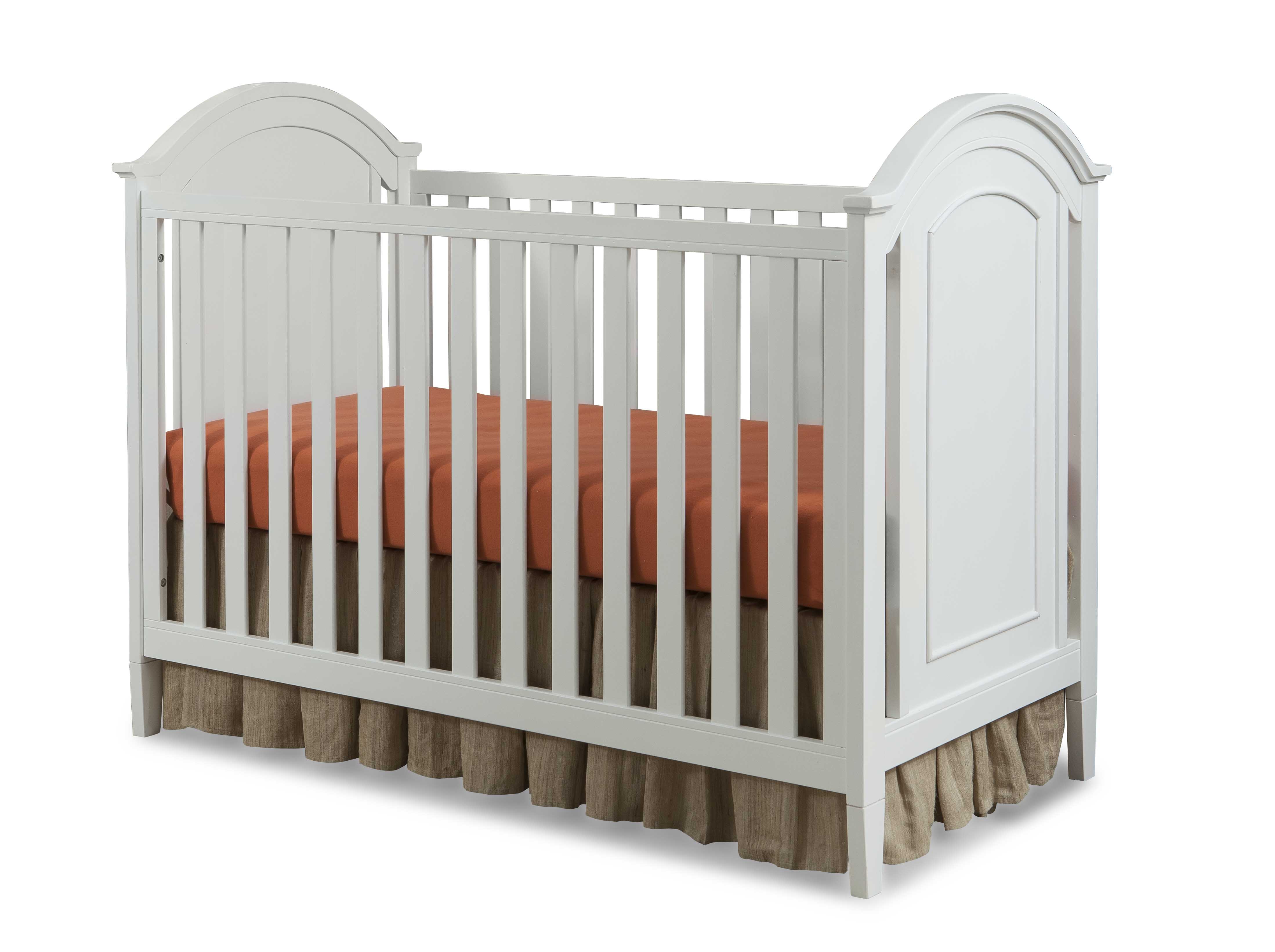 Convertible crib featuring a classic design with detailed end panels in a rich and inviting white finish.