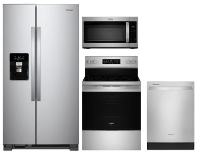 Whirlpool® 4 Piece Stainless Steel Kitchen Package with side by side refrigerator, free standing electric range, over the range microwave, and built in dishwasher,Read More
